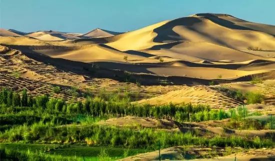 从空中俯瞰杭锦大地,穿沙公路、阳巴线、阿门其日格至独贵塔拉运煤专线、塔然高勒至锦泰工业园区运煤专线、沿黄一级公路等众多公路两侧的绿化带像绿色的绳索,点点植被像绿色的铆钉,将库布其沙漠牢牢地固定住;金灿灿的沙漠四周被绿色包围,七星湖、夜明沙等明沙地带,经过改造,已成为沙漠体验和“沙漠冲浪”爱好者的天堂。