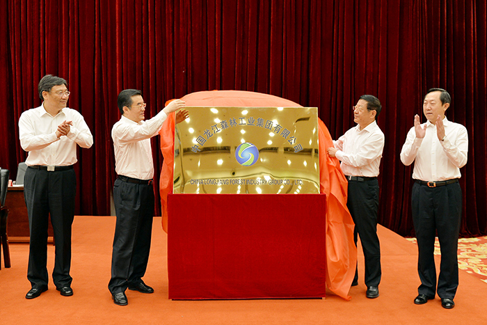 2018年6月30日,中国龙江森林工业集团有限公司在哈尔滨挂牌成立,国家林业和草原局局长张建龙(右二)、黑龙江省委书记张庆伟(左二)、黑龙江省省长王文涛(左一)等为中国龙江森林工业集团有限公司揭牌 徐旭 摄